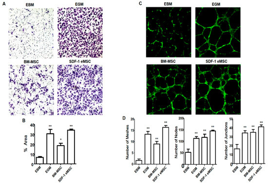 Endothelial cell migration assay (Figure 8A) revealed greater SDF-1 eMSC migration than that of BM-MSCs. For comparison, the assay was repeated using human umbilical vein endothelial cells (HUVECs). As shown in Figure 8A, SDF-1 eMSCs had a similar tendency to HUVECs with respect to cell migration. These results indicated that under high SDF-1 conditions, BM-MSCs generated more mesh than other cells, similar to the results for HUVECs (Figure 8C).