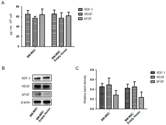 2.8. Expression Levels of SDF-1, VEGF, and bFGF Were Compared between BM-MSCs and Empty Vector Engineered BM-MSCs