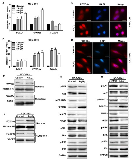 Zhang, L.; Liu, L.; Zhan, S.; Chen, L.; Wang, Y.; Zhang, Y.; Du, J.; Wu, Y.; Gu, L. Arsenic Trioxide Suppressed Migration and Angiogenesis by Targeting FOXO3a in Gastric Cancer Cells. Int. J. Mol. Sci. 2018, 19, 3739. https://doi.org/10.3390/ijms19123739