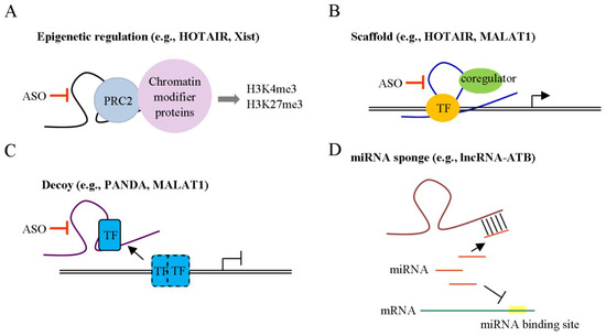 Different mechanisms of action of long non-coding RNAs (lncRNAs). lncRNAs mediate functions by regulating gene expression via diverse molecular mechanisms. (A) lncRNAs associate with chromatin-modifying complexes to modulate epigenetic modifications. (B) lncRNAs interact with transcriptional factors (TF) or coregulators to regulate gene expression. (C) lncRNAs sequester TFs away from chromatin to regulate gene expression. (D) lncRNAs serve as a sponge and interact with miRNAs to suppress miRNA–mediated effects. Antisense oligonucleotides (ASO) target lncRNAs, which associate with modulators that translocate to the nucleus, potentially providing a mechanism for targeting these pathways.
