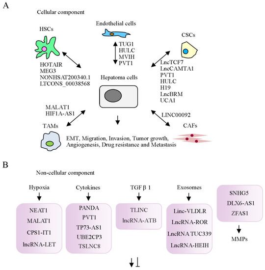 Schematic depiction of significant lncRNAs involved in interactions of hepatoma cells with tumor microenvironment components. (A) Cellular components: cancer-associated fibroblasts (CAF), hepatic stellate cells (HSC), tumor-associated macrophages (TAM), endothelial cells and cancer stem cells (CSC) cross-talk with hepatoma cells via multiple lncRNAs, as indicated. (B) Non-cellular components: reciprocal regulation of hypoxia, cytokines, TGF-β1, exosomes, matrix metalloproteinases (MMPs), and lncRNAs.