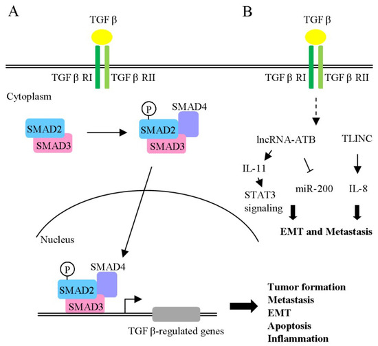 TGF-β binds to type I and type II receptors (TGF-β RI and TGF-β RII) at the cell surface. Activated TGF-β receptors induce phosphorylation of downstream signal transducer R-Smad (receptor-activated Smad: Smad2 and Smad3). Phosphorylated R-Smads, in turn, associate with Smad4 (Co-Smad) to form a trimeric Smad complex, which translocates into the nucleus and regulates target gene expression (Figure 3A). TGF-β plays a complex role in tumor progression, in particular, liver fibrogenesis and hepatocarcinogenesis [92,93], and is upregulated in HCC tissues and peri-neoplastic stroma. Interestingly, TGF-β1 is known to exert dual effects during HCC progression [94]. In the early stages, the cytokine acts as a tumor suppressor with anti-proliferative effects and stimulation of apoptosis signals. Notably, blockage of cell proliferation is mediated by cyclin-dependent kinase inhibitors and suppression of c-Myc-mediated functions. The tumor suppressor activity of TGF-β is also exerted through suppression of tumor stroma mitogens and tumorigenic inflammation. Conversely, TGF-β plays an oncogenic role, promoting tumorigenicity via several mechanisms, including stimulatory effects on cell migration, angiogenesis and metastasis. TGF-β is proposed to contribute to EMT through downregulation of E-cadherin (epithelial marker) and upregulation of Snail (mesenchymal marker). Another previous report showed that TGF-β1 enhances miR-181b expression, promoting growth, survival, migration and invasion of HCC cells [95]. Similarly, miR-23a, miR-24 and miR-27a appear to enhance tumor cell survival in HCC [96]. A novel lncRNA, designated TGF-β-induced long non-coding RNA (TLINC), was further identified as a target induced by TGF-β in both hepatic and non-hepatic cells (Figure 3B) [97]. Interestingly, expression of two TLINC isoforms (long and short) was associated with the epithelial and mesenchymal phenotype, respectively. The long isoform of TLINC was positively correlated with metastatic phenotype and increased levels of proinflammatory cytokines (IL-8). TLINC was additionally detected in both epithelial and stromal cells and identified as a tumor marker. Another lncRNA (lncRNA-ATB) is reported to be induced by TGF-β1 [98]. Clinically, lncRNA-ATB was overexpressed in HCC specimens and enhanced EMT and metastasis through modulation of the ZEB1/ZEB2/miR-200 cascade. In addition, lncRNA-ATB increased colonization of migrating cells by triggering the IL-11/STAT3 signaling pathway. Mechanistically, IL-11 mRNA stability was enhanced via lncRNA-ATB interactions, which, in turn, facilitated IL-11 secretion, suggesting a role in phosphorylation of STAT3 (Figure 3B). This autocrine regulatory mechanism promotes cell survival and colonization to distant organ sites. The collective findings indicate that several lncRNAs are regulated by TGF-β and play important roles in TGF-β-mediated effects on EMT, migration and invasion.