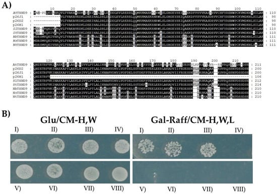 Three tomato cDNAs that interact with the Pepino mosaic virus (PepMV) triple gene block protein 1 (TGBp1) identified by yeast library screening. (A) Amino acid (aa) multiple sequence alignment of the three identified uncharacterized interactors (p26H1, p26J1, p26D2) from a tomato cDNA library and the homologous Arabidopsis thaliana thioredoxin domain-containing protein 9 (AtTXND9; NP_179489.1). The full-length protein sequence obtained from Solanum lycopersicum (Sl) and the TXND9 orthologues from Solanum tuberosum (St; XP_006352322), Nicotiana benthamiana (Nb; Nbv5.1tr6261097), Nicotiana tabacum (Nt; XP_016486197) and Nicotiana sylvestris (Ns; XP_009767764) were also used. Conserved regions corresponding to the majority of the sequences are indicated with black color and with grey the different amino acids in the conserved sequences. (B) Interaction between PepMV TGBp1 and the isolated prey plasmids (interactors) using the yeast two-hybrid assay. Co-transformed Saccharomyces cerevisiae EGY48 cells grown in nonselective glucose/complete medium lacking histidine and tryptophan (Glu/CM-H,W) (left) and selective galactose-raffinose/complete medium lacking histidine, tryptophan and leucine (Gal-Raff/CM-H,W,L) (right) of the pairwise combinations: I, pGILDA-p26//pJG4-5/p26J1; II, pGILDA-p26//pJG4-5/p26H1; III, pGILDA-p26//pJG4-5/p26D2; IV, pGILDA//pJG4-5; V, pGILDA//pJG4-5/p26J1; VI, pGILDA/pJG4-5/p26H1; VII, pGILDA//pJG4-5/p26D2; VIII, pGILDA-p26//pJG4-5.