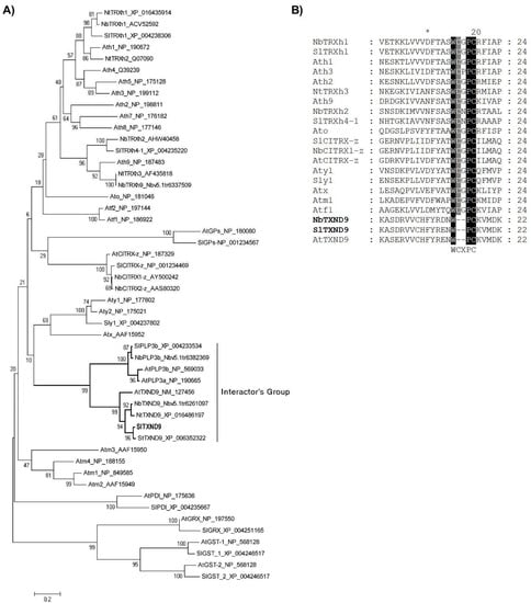 To examine the relationship of TXND9 with other members of the plant TRX superfamily, phylogenetic trees were generated. The full-length protein sequences of members of each of the identified types of TRX protein groups from tomato (type h, y and z) [,], N. benthamiana, N. tabacum and A. thaliana (types x, o, m, h, f, z, y) were included. The four related protein groups (GRX, PDI, GP, GST) in the TRX superfamily (Figure 2A) were also included, together with sequences from phosducin-like proteins 3 (PLP3) from A. thaliana, S. lycopersicum and N. benthamiana, as these shared the highest degree of amino acid identity with SlTXND9 in the TAIR database, using a 1 × 10−5 E-value as a threshold.