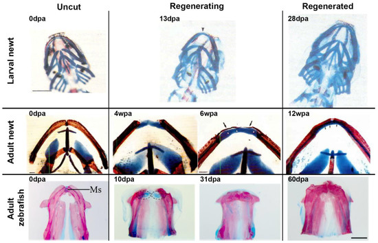 - Ghosh, S.; Thorogood, P.; Ferretti, P. Regenerative capability of upper and lower jaws in the newt. Int. J. Dev. Biol. 1994, 38, 479–490. [Google Scholar] [PubMed]