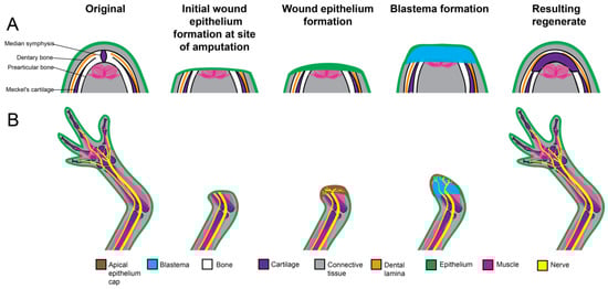 Jaw regeneration in appears to occur mostly by epimorphosis, where the surrounding tissue dedifferentiates and contributes to the formation of the regenerative organ known as the blastema. Distal transverse amputation of the lower jaw in zebrafish as well as Urodele species including the Eastern Newt, the Japanese fire belly newt, the Northern dusky salamander, the Red-backed salamander, the Northern two-lined salamander, the Marbled salamander, and the Tiger salamander (Nofophthalmus viridescens, Triturus viridescens, Cynops pyrrhogaster, Desmognathus juscus, Plethodon cinereus, Eurycea bislineata; Ambystoma opacum, Ambystoma Tigrinum) induces a regenerative response (Figure 1). The initial response to this type of injury appears to be conserved, not only between species but also between body-structures (Figure 2). Prior to blastema formation, soft tissue [61,62,74], including muscle [59,64]) and dental lamina [74], retract at the plane of amputation [61,74,75], and a wound epithelium is quickly established over the site of injury [62,74]. Work by Zhang et al. 2015 suggests that in zebrafish jaw regeneration foxi1-foxo1b-pou3f1 signaling promotes wound epithelium formation. Foxo1 is also upregulated in the early (24 h) stages of axolotl limb regeneration and appears to also be linked to the wound healing response in this organism as well [76].