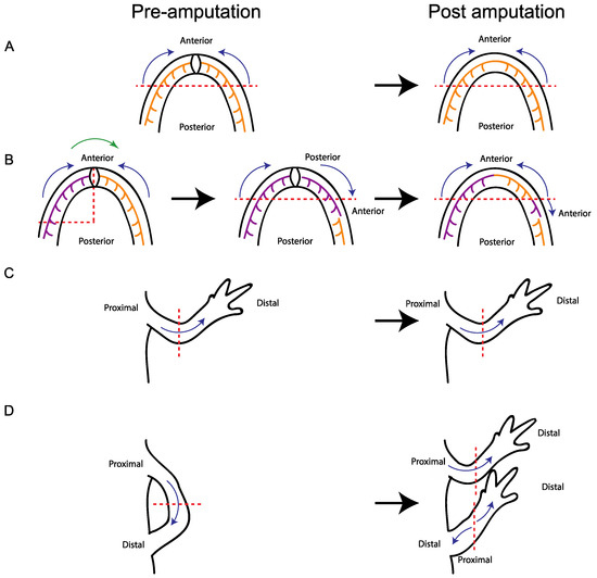 Plasticity of tissue polarity during jaw and limb regeneration is conserved. (A) Jaw regeneration normally occurs with a posterior to anterior polarity; (B) When a portion of the jaw is reversed along its anterior-posterior axis and amputated, rather than generating structures that are posterior to the amputation plane, the blastema cells reverse their polarity so that they only regenerate structures anterior to the amputation plane. Dental lamina migrates into the adult jaw regenerate in a unidirectional manner, from posterior to anterior; however, the dental lamina migrates into the regenerate in the appropriate direction, despite the grafted tissue being rotated relative to the host site and regenerate; (C) During normal limb regeneration, the regenerate retains the proximal/distal polarity of the original limb; (D) Limbs with reversed proximal/distal axes can be generated by attaching the autopod to the flank. When the limb is amputated, the part of the limb that remains attached to the flank has the reverse proximal/distal orientation. However, rather than regenerating limb structures proximal to the wound site, the blastema reverses its polarity such that it regenerates tissue distal to the amputation plane. Therefore, there is a conserved mechanism, which prevents regeneration in a proximal direction. Red dashed lines represent the plane of amputation. Blue arrows indicate the direction of tissue polarity. Purple and orange lines represent dental lamina. Green arrow represents tissue grafting. Black arrows represent amputation and regeneration time.
