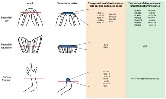 Hox gene re-expression is a characteristic of regeneration shared between species and anatomical locations. Jaw, limb and tail blastema tissue exhibit the re-expression of both developmentally related and unrelated Hox genes. Red line indicates plan of amputation; blue tissue indicates blastema tissue.