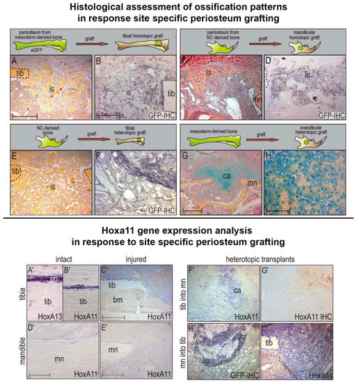 The capacity of bone derived mesenchymal cells to participate in bone restoration is dependent on both the donor and recipient site. Top panel: Robust tibia bone repair, whereby pentachrome staining indicates intramembranous ossification (A), is facilitated directly by the homographic translation, survival and differentiation of GFP-positive tibial periosteum at the site of injury (B, GFP immunohistochemistry). A similar response is documented in mandibular sites (C) transplanted with GFP-positive mandibular periosteum (D). Although intramembranous bone is generated in tibial sites (E) in response to engraftment, survival and differentiation of GFP positive mandibular derived periosteum cells (F); tibial periosteum transplanted into the mandible exhibits failed integration due to inappropriate endochondral ossification (G) and cartilage condensation (H, high magnification). ca, cartilage; is, injury site; mn, mandible; tib, tibia. Scale bar: 200 µm in A, C, E; 100 µm in B, D, F; 400 µm in G; 50 µm in H. Lower panel: Periosteum derived from the adult tibia expresses Hoxa13 (A’) and Hoxa11 (B’) under homeostatic conditions, and Hoxa11 in response to injury (C’). Hoxa11 expression is absent in mandibular periosteum under both normal and injury conditions (D’,E’ respectively). Tibia periosteum retains Hoxa11 expression when transplanted into the Hox-negative mandibular environment (F’,G’), while GFP-positive mandibular periosteum (H’, GFP expression encompassed by dashed lines) grafted into the tibia exhibits Hoxa11 expression (I, mandibular cells encompassed by dashed lines) bm, bone marrow; ca, cartilage; mn, mandible; po, periosteum; tib, tibia. Scale bar: 50 µm in A, B, D, F, G; 100 µm in E; 200 µm in C, H, I. (Images republished with permission from Leucht et al. 2008).
