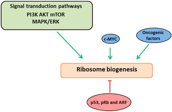 Ribosome biogenesis links with growth and cell proliferation pathways. Ribosome biogenesis is interlinked and coordinated with the cell cycle phases through a series of signaling cascades (PI3K-AKT-mTOR and ERK/MAPK pathways). These pathways induce ribosome biogenesis at various stages by acting directly on RNA polymerases or via the oncogenic factor, c-Myc (indicated in green arrows). Altered ribosome biogenesis is sensed by quality control check points which activate/stabilize the tumor-suppressor proteins (p53, ARF and pRb) resulting in negative regulation of ribosome biogenesis (indicated in red arrow).
