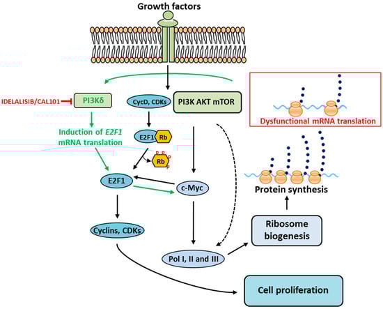 mRNA translation stress feedback to ribosome biogenesis and cell proliferation. Ribosome biogenesis and mRNA translation are large metabolic processes promoting the cellular growth and proliferation. Growth factors trigger the signaling cascades which induce RiBi via c-Myc and cell proliferation by activating the CDKs, E2F1, and cyclins (indicated with black arrows). In the case of dysfunctional mRNA translation (red box), stress signals from polysomes activate PI3Kδ and trigger a novel signaling pathway (indicated with green arrows) independent of AKT and mTOR, resulting in increased translation of E2F1 mRNA. The newly synthesized active E2F1, in turn, stimulates the downstream transcription targets c-Myc and cyclins to induce ribosome biogenesis and cell proliferation. Idelalisib/CAL-101 is a selective inhibitor of PI3Kδ (indicated with red T-bar). This novel signaling pathway provides the essential cellular feedback response to mRNA translation stress and its synchronization with ribosome biogenesis and cell proliferation.