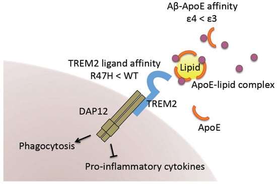 A rare variant of the TREM2 gene (R47H, rs75932628) is another strong genetic risk factor for AD, leading to a two-fold increase in the risk of its occurrence [,,]. The TREM2 gene is located on chromosome 6p21.1 and encodes a transmembrane receptor []. In the brain, TREM2 is primarily expressed in microglia, the cell type that mediates synapse refinement and maintains the microenvironment for homeostasis in brain. TREM2 is involved in the refinement of synapses involved in memory formation. For example, in the developing brain, TREM2 is crucial for microglia to prune supernumerary synapses []. TREM2 has also been reported to mediate multiple functions of microglia such as phagocytosis, inhibition of inflammatory signaling, and promotion of cell survival []. TREM2 is reported to be involved in signaling pathways involving binding ligands such as anionic bacterial production and phospholipids []. For instance, TREM2 activation in microglia upon ligand binding induces a signaling cascade including DAP12 phosphorylation, resulting in increased phagocytosis and decreased pro-inflammation [,,]. Therefore, to fully understand the role of the TREM2 variant in AD pathogenesis, researchers should aim to elucidate how this variant alters microglial function. TREM2 R47H has been reported to decrease binding affinity of TREM2 for lipid ligands and the clearance of lipoprotein particles. Although the mechanisms of lipid-Aβ complex clearance in the brain are still under investigation, it is possible that TREM2 R47H contributes to Aβ accumulation by attenuating microglial-mediated Aβ clearance (Figure 2). Nonetheless, it remains to be determined whether TREM2 R47H leads to loss-of-function or gain-of-function with regard to TREM2.