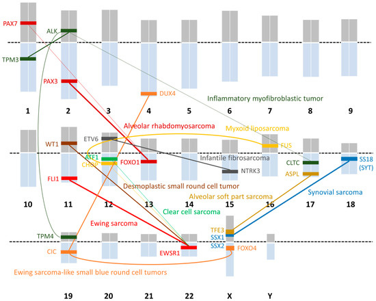 STS is a rare tumor accounting for only 5% of all malignant tumors, but there are diverse heterogenic components among the subtypes of STS. There are more than 50 pathological subtypes of STS in the current World Health Organization (WHO) classification [7]. The progress that has been made in pathological technology and the accumulation of pathological and clinical data have enabled precise diagnoses and classifications. The identification of translocations is one example of this. Approximately 300 gene fusions are known in mesenchymal tumors, and ~20% of the STS subtypes have chromosomal translocations; these are called translocation-related sarcomas (TRSs) [1]. The major TRSs and their specific translocations and fusion genes are shown below (Table 1, Figure 1).