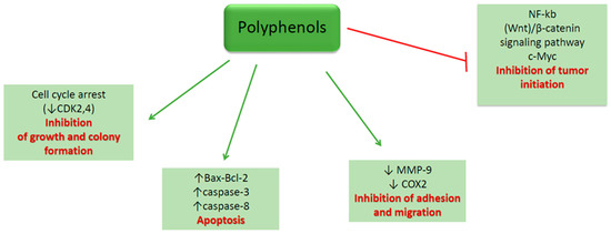 Schematic representation of the polyphenols’ major mechanisms of action on colorectal cancer (CRC) cells. Polyphenols: (i) Determine cell cycle arrest by downregulating cyclin-dependent kinase 2, 4 (CDK 2, 4), (ii) induce apoptosis by upregulating B cell lymphoma 2 associated protein X and B cell lymphoma 2 (Bax-Bcl-2), caspase-3 and caspase-8, (iii) inhibit cell adhesion and migration through the downregulation of matrix metalloproteinase 9 (MMP-9) and cyclooxygenase 2 (COX2) and (iv) stop tumor initiation by altering nuclear factor kappa-light-chain-enhancer of B cells (NF-kb)/β-catenin signaling pathway.