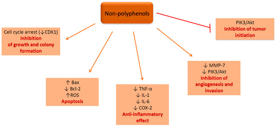 Non-polyphenolic compounds display chemopreventive effects on CRC cells in vitro modulating signaling pathways with impact on cell cycle arrest, apoptosis, invasion, inflammation and much more (Figure 2).