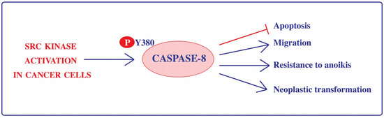 Importantly, Src kinase activity is aberrantly upregulated in many tumors [57]; consistently, the phosphorylation of Caspase-8 on Tyr380 has been reported in several cancer cell lines (including colorectal carcinoma, hepatocellular carcinoma and glioblastoma cell lines) and its occurrence has been correlated with impairment of apoptotic signaling downstream death receptor stimulation and resistance to anoikis [10,17]. Recently, the work of several laboratories clearly established that the phosphorylation of Tyr380 ensures not only the downregulation of Caspase-8 proapoptotic function but perfectly matches with the gain of new tumorigenic functions, including enhanced adhesion and migration properties ([37,38,39,58,59,60,61] in vitro neoplastic transformation, and resistance to anoikis [17] (Figure 1)).