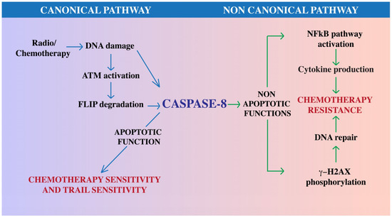Role of Caspase-8 in cancer therapy. Caspase-8 may modulate the response to therapeutic approaches through canonical and non-canonical functions. Chemotherapy and radiotherapy promote DNA damage that in turn switches-on the enzymatic activation of Caspase-8, either directly or via the ATM-dependent downregulation of FLIP protein levels. Caspase-8 enzymatic activation promotes apoptosis therefore enhancing cancer cell sensitivity to chemotherapy and TRAIL. Cancer cells may rewire Caspase-8 functionality; in these contexts, Caspase-8 can promote NF-κB activity, cytokine production and DNA repair, therefore promoting resistance to chemotherapy. Overall, we suggest that this dual role of Caspase-8 in cancer may be exploited to ameliorate cancer therapy. Blue arrows for canonical pathway; green arrows for non canonical pathway.