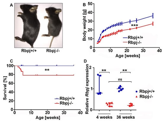 For the investigation of liver regeneration in the context of cholestatic liver disease, we used a transgenic mouse model for the abrogation of Notch signalling []. We crossed a conditional Rbpj cKO mouse [] with an AlfpCre mouse [] on a C57BL/6J background (Figure S1A–C). All Rbpj knockout (Rbpj−/−) mice were phenotypically small (Figure 1A). The body weight was monitored for up to 36 weeks and reduced body weight of Rbpj−/− mice was observed at every monitored time point (Figure 1B). The reduced body weight was observed in both sexes and was more pronounced in male mice (Figure S1D,E). Liver-specific deletion of Rbpj induces increased lethality within five weeks after birth (Figure 1C). No further lethality was observed at later time point. In order to verify the efficiency of Rbpj deletion in the liver, we performed quantitative real-time polymerase chain reaction (qRT-PCR) and Western blotting. We observed reduction of Rbpj expression at mRNA and protein levels in Rbpj−/− mice (Figure 1D; Figure S1F).