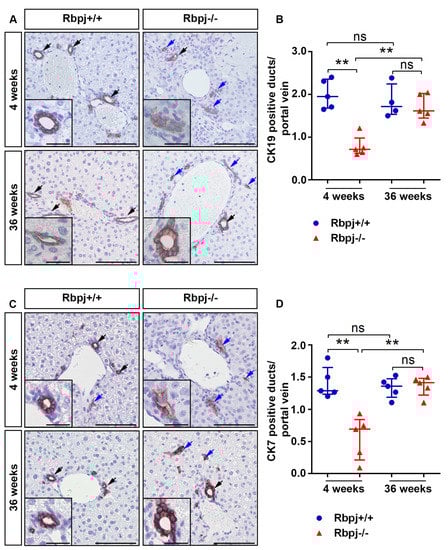 Impaired intrahepatic bile duct development in Rbpj−/− mice. Representative photographs of CK19 (A) and CK7 (C) immunostaining performed on liver sections of 4- and 36-week-old mice. Four-week-old Rbpj−/− liver exhibit formation of immature, scattered bile duct structures; there are some clusters of CK19/CK7 positive cells without a clear lumen or dispersed single CK19/CK7 positive cells (blue arrow). In contrast, 36-week-old Rbpj−/− liver has a combination of matured CK19/CK7 positive bile duct structures (black arrow) and persisting irregular CK19/CK7 positive clusters (blue arrow) (n = 5; scale bar: 100 µm (inlets (A+C) represents a high magnification of a duct structure from the corresponding figure, scale bar: 25 µm)). Scatter dot plots shows CK19 (B) and CK7 (D) positive lumen structures per portal vein (n = 5; ** p ≤ 0.01, ns = not significant; Mann–Whitney test (Two tailed)).