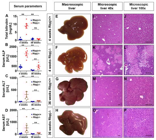 Loss of RBPJ results in cholestasis and hepatic necrosis. (A–D) Serum parameters indicating liver inflammation and cholestasis. Scatter dot plots of (A) TB (total bilirubin (mg/dL)), (B) ALP (alkaline phosphatase (U/L)), (C) ALT (alanine transaminase (U/L)), and (D) AST (aspartate transaminase (U/L)) measured in mouse serum at 4 and 36 weeks from Rbpj+/+ and Rbpj−/− mice (n = 5–6; ** p ≤ 0.01, Mann–Whitney test (Two tailed)). All four serum parameters are increased in 4-week-old Rbpj−/− mice. (E–H) Representative photographs of macroscopic liver from Rbpj+/+ and Rbpj−/− mice at 4 and 36 weeks (n = 5–6). (I–P) Representative photographs of Hematoxylin & Eosin staining from Rbpj+/+ and Rbpj−/− liver. Liver of 4-week-old Rbpj−/− mice depicts zone 2 associated confluent necrosis (K + L), whereas liver from 36-week-old Rbpj−/− mice shows recovery from Rbpj deletion induced liver necrosis (O + P) (I = 5–6; scale bar: 100 µm).