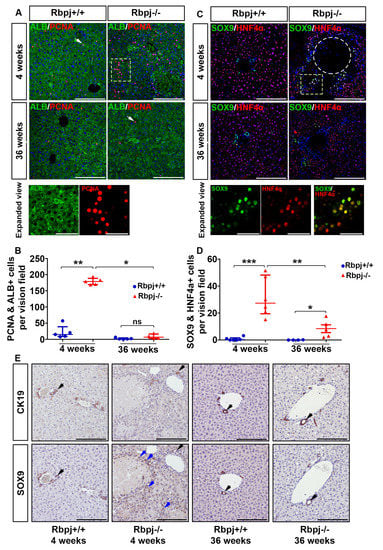 Impaired IHBD maturation obstructs the bile acid flow, which leads to accumulation of bile acids in the hepatic compartment causing necrosis (Figure 3K,L and Figure S2A). Liver regeneration was observed as a compensatory mechanism for the loss of hepatocytes in 4-week-old Rbpj−/− mice as shown by immune histochemistry (IHC) analyses using the proliferation marker PCNA and the hepatocyte marker Albumin (Figure 4A,B). In contrast, livers of 36-week-old Rbpj+/+ and Rbpj−/− mice did not exhibit elevated hepatocyte proliferation indicating a quiescent phenotype (Figure 4A,B). We confirmed these results by western blot analysis for PCNA (Figure S3A). A correlation of the number of PCNA positive hepatocytes with the non-necrotic area revealed that an increased number of hepatocytes were able to proliferate in a less necrotic environment in 4-week-old Rbpj−/− mice (Figure S3B). High levels of necrosis suggest an impaired proliferation capacity and an increased mortality of Rbpj−/− mice. Since cholangiocyte maturation and differentiation are impaired due to RBPJ deletion, we questioned the possible activation of hepatocyte transdifferentiation as one of the mechanisms for liver regeneration. Under normal physiological conditions, the expression of SOX9 is restricted to bile duct cells and HPCs. SOX9 expression in hepatocytes is a sign of hepatocellular plasticity and enables cells to enter an intermediate phenotype. Therefore, we co-stained liver sections with the progenitor cell marker SOX9 and hepatocyte cell marker HNF4α (Figure 4C,D). In addition, we stained for SOX9 and the biliary epithelial cell marker CK19 on serial sections (Figure 4E). Enrichment of SOX9+ HNF4α+ and SOX9+ CK19− cells surrounding necrotic areas were evident in Rbpj−/− liver at the age of 4 weeks (Figure 4C,E). Cellular morphology of SOX9+ HNF4α+ CK19− cells resembled hepatocytes, indicating the possibility of hepatocyte transdifferentiation following cholestatic liver damage. Our findings are in line with earlier publications reporting activation of SOX9 in cells bearing hepatocyte morphology [,]. To estimate proliferating transdifferentiated hepatocytes, we performed SOX9/PCNA co-immunostaining. We observed 13.6% SOX9+ proliferating hepatocytes in 4-week-old Rbpj−/− mice (Figure S3C,D).