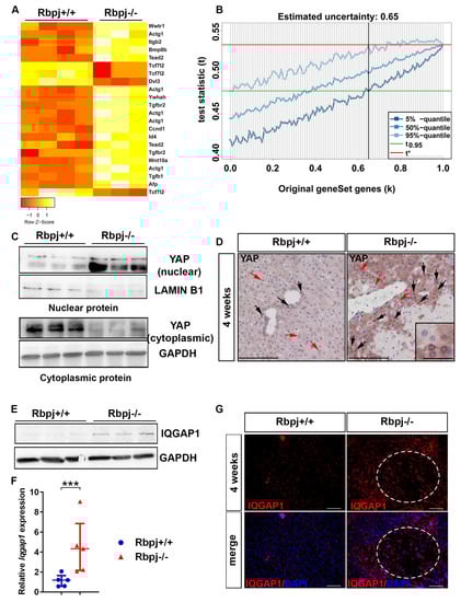 Notch-pathway deficiency induced cholestasis results in YAP activation and deregulation of the Hippo-pathway gene set. (A) Heatmap of differentially regulated genes of the Hippo pathway between 4-week-old Rbpj+/+ and Rbpj−/− mice (n = 3–4). (B) GiANT of the Hippo pathway gene set in 4-week-old murine liver, which quantified the uncertainty in the Hippo pathway (n = 3) (t: test statistic of interest; t*: value statistic of the original gene set; k: tested degree of uncertainty). (C) Immunoblot of nuclear and cytoplasmic YAP in the liver of Rbpj+/+ and Rbpj−/− mice. (n = 3). Full-length immunoblots are depicted in Figure S5A,B (D) YAP immunostaining showed increased nuclear staining of YAP in Rbpj−/− hepatocytes (n = 5; scale bar: 100 µm (inlet shows expanded view of a particular region of the original image, scale bar: 25 µm)); black arrows represent nuclear YAP+ cells and red arrow represents nuclear YAP- cells). (E) Immunoblot of IQGAP1 of whole liver protein lysates (n = 3). Full-length immunoblot is depicted in Figure S5D. (F) Relative mRNA expression of Iqgap1 normalised to RNA polymerase II (n = 5; *** p ≤ 0.001, Mann–Whitney test (Two tailed)). (G) Representative photographs of IQGAP1-IF (red fluorescence signals depict IQGAP1 expression, upper panel) and IQGAP1-IF with nuclear DAPI stain (lower panel, merged) of Rbpj+/+ and Rbpj−/− liver. Necrotic area is circled by white dots (n = 3; scale bar: 100 µm).