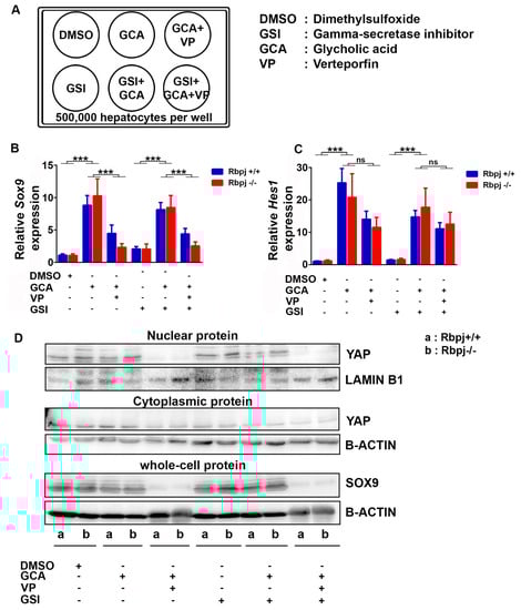 500,000 primary hepatocytes from Rbpj+/+ and Rbpj−/− mice were plated in 6-well plates. 3 h after plating the hepatocytes cells were washed with 1× phosphate-buffered saline (PBS). Immediately we started the treatment with 500 µM GCA for 6 h to induce in vitro cholestatic liver injury. In addition to GCA, cells were also incubated with 10 µM VP to block YAP/TEAD-dependent and 10 µM GSI in inhibit Notch pathway.