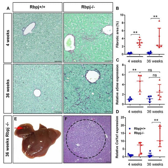 The observed phenotype of cholestasis and hepatic necrosis in the Rpbj−/− mouse model reflects CLD. CLD is a well-known cause of liver fibrosis and hepatocarcinogenesis. Therefore, we carefully analysed the samples for liver fibrosis and signs of tumor formation. It has been shown that Notch activation/repression, as well as loss of Rbpj, is involved in tumor formation [,,]. Here we depicted that liver-specific loss of Rbpj resulted in liver fibrosis, which is slightly increased in 36-week-old Rbpj−/− mice (Figure 7A,B). The micronodular fibrosis was located in the periphery of the necrotic area in 4-week-old Rbpj−/− mice. In 36-week-old Rbpj−/− mice, the fibrosis persisted in zone 2, in addition, an increase of fibrosis was seen around the central lobular veins. We observed by qPCR analysis an increased expression of αSma, a marker for stellate cell activation (Figure 7C) and Col1a1, a marker for liver fibrosis (Figure 7D) in Rbpj−/− mice. We could detect liver foci formation in one out of seven Rbpj−/− mice at the age of 36 weeks (Figure 7E,F) suggesting that increased liver fibrosis formation by the loss of functional RBPJ might play a role in hepatocarcinogenesis.