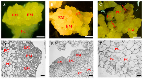 Morphology and histology of representative structures in the in vitro culture of Brachypodium distachyon callus. (A–C) General morphology and (D–E) histological section of the callus on the 30th (A,D), 60th (B,E), and 90th (C,F) day of cultivation. The red arrows point at brownish parts of the callus. EM: embryogenic masses, PC: parenchymatous cells. Scale bars, (A–C)—1 mm, (D)—10 μm, (E)—50 μm, (F)—10 μm.