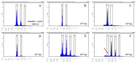 Flow cytometry analyses revealed significant differences in the nuclear DNA content between calli at different times of culture (Figure 2). The zygotic embryo was usually characterised by the presence of nuclei with 2C and 4C DNA content, but a small peak representing nuclei with 8C DNA content was also present (Figure 2A). Separate analyses of embryogenic masses and non-embryogenic parts of 30-day-old calli demonstrated similar patterns of relative DNA contents in both parts, with 2C and 4C nuclei predominating (Figure 2B–D). However, parenchymatous cells from 60-day-old calli were significantly different, with clear peaks of DNA content ranging from 2C to 16C clearly observed (Figure 2E). In 90-day-old calli, in which it was difficult or impossible to distinguish different cell types, flow cytometry analysis revealed the presence of peaks representing 4C, 8C, and 16C DNA content (Figure 2E). The absence of a detectable 2C DNA content peak in 90-day-old calli was noted (Figure 2F, red arrow).