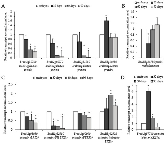 Relative transcript accumulation levels of genes associated with cell wall architecture, i.e., AGPs (Bradi3g39740, Bradi2g60270, Bradi2g31980, and Bradi5g18950), EXTs (Bradi2g05080, Bradi1g22980, Bradi2g00900, Bradi3g12902, and Bradi2g57740), and PECTIN METHYLESTERASE (Bradi3g24750)), on the 30th, 60th, and 90th day of cultivation. Relative transcript accumulation levels of (A) AGPs, (B) EXTs, (C) PECTIN METHYLESTERASE, (D) chimeric EXT Bradi3g12902. The relative transcript accumulation levels were normalised to an internal control (AK437296, gene encoding for ubiquitin) and calibrated to the control (explants, zygotic embryos); *: value is significantly different from the control (Student’s t-test, p < 0.05; n = 3 ± SD).