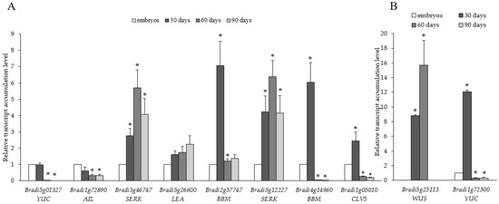 Relative transcript accumulation levels of (A) YUC (Bradi5g01327), AIL (Bradi1g72890), SERK (Bradi3g46747 and Bradi5g12227), LEA (Bradi5g26600), BBM (Bradi2g577747 and Bradi4g14960), CLV3 (Bradi1g05010), and (B) WUS (Bradi5g25113) and YUC (Bradi1g72500) genes on the 30th, 60th, and 90th day of cultivation. The relative transcript accumulation levels were normalised to an internal control (AK437296, a gene encoding ubiquitin) and calibrated to the control (explants, zygotic embryos); *: value is significantly different from the control (Student’s t-test, p < 0.05; n = 3 ± SD).