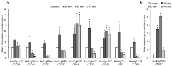 Relative transcript accumulation levels of (A) CYCD3 (Bradi3g58300), CYCA3 (Bradi1g14820), CYCB1 (Bradi2g52760), CDKPK (Bradi1g54570), CDKA (Bradi3g02270), CDKB2 (Bradi3g40200), CDKD (Bradi2g26510), WEE (Bradi3g03112), and CYCD4 (Bradi4g32556), and (B) CDKB1 (Bradi4g25980) on the 30th, 60th and 90th day of culture. The relative transcript accumulation levels were normalised to an internal control (AK437296, gene encoding ubiquitin) and calibrated to the control (explants, zygotic embryos); *: value is significantly different from the control (Student’s t-test, p < 0.05; n = 3 ± SD).