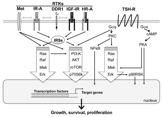 A simplified representation showing the interplay between the major signaling cascades activated by tyrosine kinase receptors (RTKs) and TSH-Receptor (TSH-R). Activation of TSH-R on the cell surface by TSH results in the activation of two major classes of G proteins, namely Gαq and Gαs. Gαs, through the second messenger, cAMP, activates the major signaling pathway PKA/Mek/Erk. In addition, PKA may directly stimulate transcription factors in the nucleus, resulting in the activation of target genes involved in thyroid follicular cells function, growth, and survival. Gαq activates the signaling cascades PKC/Ras/Raf/ERK/p90RSK, PI3-K/AKT/mTOR/p70S6k, and PKC/NFkB. RTKs (i.e., Met, IR-A, DDR1, IGF-1R and HR-A) directly or via IRSs, induce MAPK (Ras/Raf/Mek/Erk) and PI3-K/AKT/mTOR/p70S6k signaling cascades. All these pathways interact with each other, resulting in a multitude of cross-talks. MAPK and PI3-K cascades are common to both TSH-R and RTKs downstream-mediated signaling, and are represented with big arrows, as they are the major players of follicular cell proliferation.