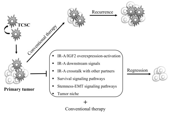 Schematic representation of possible therapeutic strategies targeting thyroid cancer initiating progenitor cells to eradicate TC. Thyroid cancer stem cells (TCSC) are considered to be responsible of TC initiation, progression, therapeutic resistance, and recurrence. Conventional therapy fails to destroy these cells, contributing to tumor relapse and metastases. TCSC-focused therapies may include strategies aiming to inhibit IR-A/IGF2 overexpression and activation, IR-A-mediated mitogenic signals, the crosstalk between IR-A and other molecular partners, signaling pathways regulating survival, stemness, EMT programs, and the tumor niche. This strategy combined with conventional therapy could allow us to eradicate tumor cells and obtain complete remission.