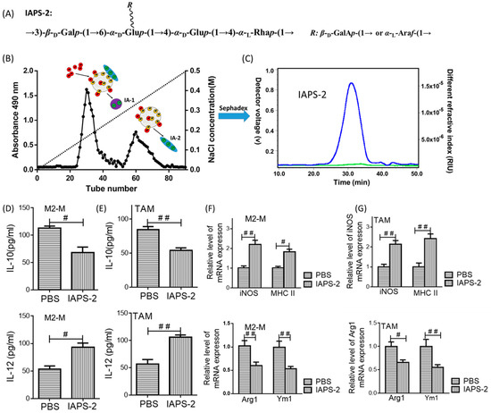 IAPS-2 promoted M2-macrophage toward M1-type polarization. M2-M and tumor associated macrophages (TAMs) were treated with IAPS-2 (50 μg/mL) for 24 h. (A) The chemical structure of IAPS-2; (B) the scheme to isolate different IA fractions based on acidity (Red, NaCl solution, purple, fraction IA-1, blue, fraction IA-2); (C) the purification statement of IAPS-2, which has been presented in our previously published paper; the concentration of IL-10, IL-12 in the supernatants from M2-M and TAMs (D,E) were tested by ELISA and the gene expression of M1-marker (iNOS and MHC II) and M2-marker (Arg1 and Ym1) in both cells were also examined by Q-PCR (F,G). The data are representative of three independent experiments and expressed as the means ± SD. # p < 0.05 or ## p < 0.01 compared with the phosphate-buffered saline (PBS) group.
