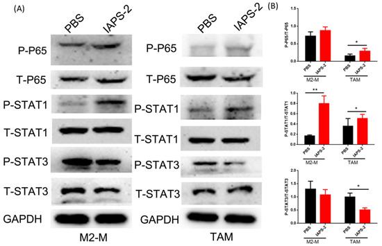 IAPS-2 induced repolarization of M2-type macrophage in vitro via activating NF-κB and STAT1 signaling and inhibiting STAT3 signaling. M2-M and TAMs were incubated with 50 μg/mL IAPS-2 for 24 h, (A) the expression of phosphorylated P65 (p-P65), total P65, phosphorylated STAT1 (p-STAT2), total STAT1 (T-STAT1), phosphorylated STAT3 (p-STAT3) and total STAT3 (T-STAT3) in both cells were evaluated by Western blot; (B) grey analysis of Western blotting. The data are representative of three independent experiments. The values are expressed as the means ± SD. * p < 0.05, ** p < 0.01.