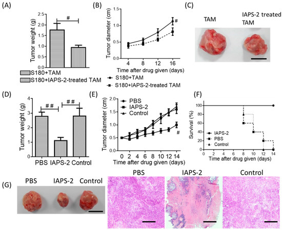 IAPS-2 treatment markedly retarded tumor growth. Mixed tumor cells with TAMs incubated with or without IAPS-2 and then these cells were injected into mice. Mean tumor weights (A), tumor growth curves (B) after mixed cells were injected into mice for 16 days. Representative images of tumor harvested from mice in each treatment cohort (C), scale bar, 1 cm. Mean tumor weights (D), tumor growth curves (E), and survival rate of tumor-bearing mice (# vs PBS group) (F) from mice receiving intratumoral injections of IAPS-2. Representative images of tumor (G, scale bar, 1 cm) and tumor sections examined by H&E staining (scale bar, 100 μm) from mice treated with 50 mg/kg IAPS-2. n = 6 mice/group. The values are expressed as the means ± SD. # p < 0.05, ## p < 0.01.