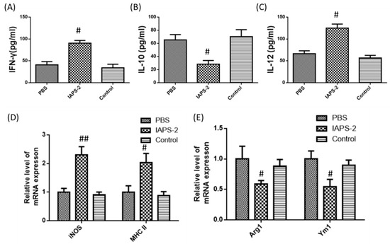 IAPS-2 altered TAMs phenotype and restored immunosurveillance against a tumor in vivo. TAMs purified from each treatment cohort were cultured for 24 h. The expression of (A–C) IFN-γ, IL-12, IL-10, and (D,E) iNOS, MHC II, Arg1 and Ym1 were examined by ELISA or q-PCR. The values are expressed as the means ± SD (n = 6 mice/group) vs. PBS group, # p < 0.05, ## p < 0.01.