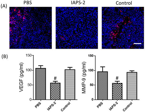 After we found that IAPS-2 could alter the type of macrophages and show an anti-tumor effect via regulating the function of TAMs, we further started to observe the effect of IAPS-2 on angiogenesis in tumors, which visually presented the growth of tumors. The analysis of the angiogenesis showed that IAPS-2 evidently reduced the concentration of MMP-9 and VEGF in S180 tumor tissues (Figure 6B). In particular, the immunofluorescence analysis of CD31 (an endothelial marker) significantly demonstrated that mice treated with IAPS-2 have a lower density of blood vessels (Figure 6A). Taken together, these analyses suggested that IAPS-2 displayed potent ability of anti-angiogenesis and can treat tumors.