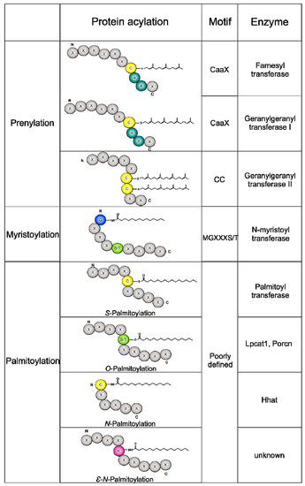 - Jiang, H.; Zhang, X.; Chen, X.; Aramsangtienchai, P.; Tong, Z.; Lin, H. Protein lipidation: Occurrence, mechanisms, biological functions, and enabling technologies. Chem. Rev. 2018, 118, 919–988. [Google Scholar] [CrossRef] [PubMed]