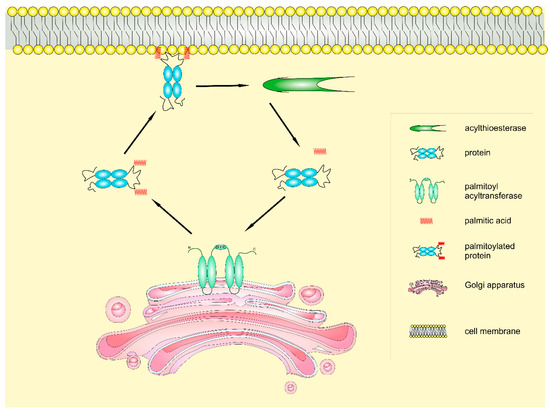 About 10% of the genome codifies for palmitoylable proteins, which all together constitute the so-called “palmitoylome”. High-throughput screening using mass spectrometry has revealed that human diseases including cancer, viral infections, and immunological and neurodegenerative disorders are associated with severe alterations in the palmitoylome [24]. Moreover, recent studies have demonstrated that nutrient-derived molecules such as insulin and fatty acids may critically change protein palmitoylation [25,26].