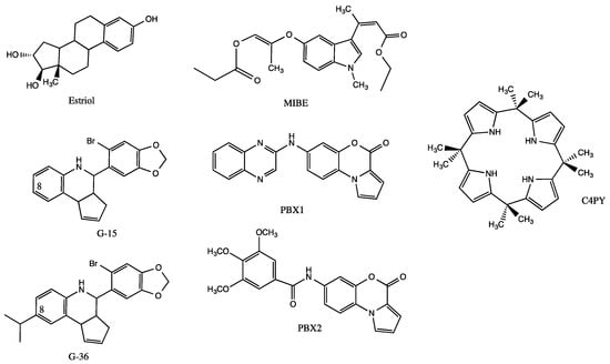 - Lappano, R.; Rosano, C.; de Marco, P.; de Francesco, E.M.; Pezzi, V.; Maggiolini, M. Estriol acts as a GPR30 antagonist in estrogen receptor-negative breast cancer cells. Mol. Cell. Endocrinol. 2010, 320, 162–170. [Google Scholar] [CrossRef] [PubMed]