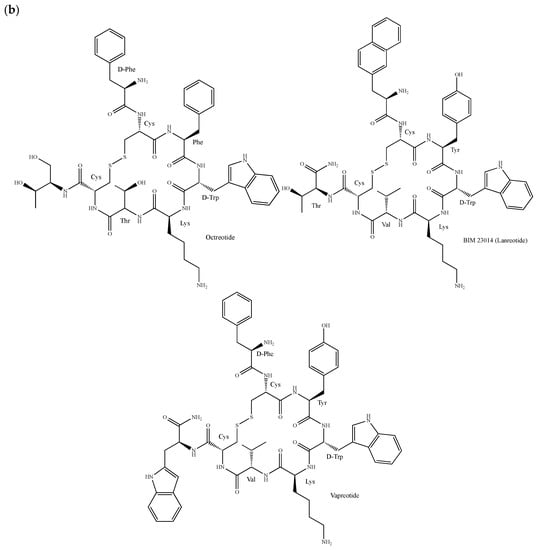 - Smith-Jones, P.M.; Bischof, C.; Leimer, M.; Gludovacz, D.; Angelberger, P.; Pangerl, T.; Peck-Radosavljevic, M.; Hamilton, G.; Kaserer, K.; Kofler, A.; et al. DOTA-lanreotide: A novel somatostatin analog for tumor diagnosis and therapy. Endocrinology 1999, 140, 5136–5148. [Google Scholar] [CrossRef]