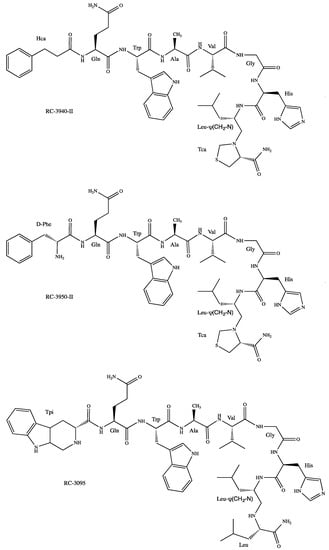 - Miyazaki, M.; Lamharzi, N.; Schally, A.V.; Halmos, G.; Szepeshazi, K.; Groot, K.; Cai, R.Z. Inhibition of growth of MDA-MB-231 human breast cancer xenografts in nude mice by bombesin/gastrin-releasing peptide (GRP) antagonists RC-3940-II and RC-3095. Eur. J. Cancer 1998, 34, 710–717. [Google Scholar] [CrossRef]