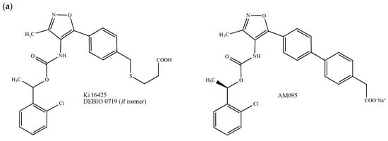 Principally found in extracellular fluids, lysophosphatidic acid (LPA) and its endogenous derivatives exert pleiotropic effects including cell proliferation, migration, invasion, differentiation and adhesion, through at least six class A GPCRs, namely LPA1–6, which also play an important role in mediating malignant behaviors in breast cancer [64,65]. Due to the growing interest in LPA receptors and based on the fact that a well-conserved glutamine (Gln-125) present in the LPA1 binding-pocket governs the interaction with LPA and directs LPA/S1P receptors selectivity, small LPA receptors modulators mimicking LPA have been synthesized [66,67]. In particular, the LPA1/3 antagonist called Debio 0719 (Figure 2a) has been proposed as a promising molecule for breast cancer treatment. This compound, which corresponds to the R-isomer of the isoxazolic LPA1/3 competitive inhibitor Ki164425, exhibits higher antagonist effects for LPA1 and LPA3 (IC50 = 60 nM and 660 nM, respectively) than the parent molecule Ki16425 drawn in Figure 2a (IC50 = 130 nM and 2.3 μM, respectively) [68,69,70]. In vitro, Debio 0719 inhibits the LPA-dependent invasion of 4T1 mouse mammary cancer cells [69]. In BALB/c mice orthotopically inoculated with 4T1 cells in the mammary gland, the administration of Debio 0719 during the early phase of tumor growth reduces the number of spontaneously disseminated tumor cells to bone, lungs and liver [69,71]. Analogous results were observed using an experimental pulmonary metastatic model consisting of athymic NRC nu/nu mice inoculated with MDA-MB-231 human breast cancer cells [71]. Since Debio 0719 did not affect the growth of primary tumors and tumor-induced angiogenesis [69,71], it could be proposed, therefore, as a metastasis suppressor. Finally, the compound AM095, another Ki16425-derived isoxazole carboxylic acid derivative developed by the Amira Pharmaceuticals Company, showed interesting results on TNBC animal models (Figure 2a) [72].