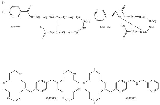 Structure of (a) CXCR4 and (b) CXCR5 peptidic and heterocyclic inhibitors. NaA and ipLys correspond to l-3-(2-naphtyl)alanine and N-isopropyl-l-lysine, respectively.