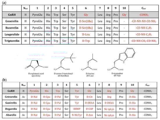 Structure of (a) GnRHR agonists (goserelin, buserelin, leuprolide and triptorelin) and (b) GnRHR antagonists (cetrorelix, ganirelix, degarelix, and abarelix). The residues that are subject to pharmacomodulation are indicated in red. The structures and symbols of the non-proteinogenic amino acids of these molecules are specified.