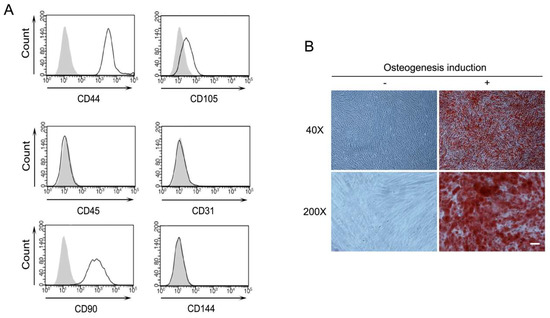 While PDLSCs were certified the surface expression of CD146 and STRO-1 by the supplying company, essential characteristics for mesenchymal stem cells (MSC) were investigated [18]. The immunophenotype of PDLSCs was analyzed by flow cytometry. MSC-associated surface markers, including CD44, CD90, and CD105, were highly expressed on the cell surface of PDLSCs, which is consistent with previous studies in the MSC field [18,19,20,21]. However, the hematopoietic marker (CD45) and endothelial cell markers (CD31 and CD144) were not observed (Figure 1A). In order to assess the differentiation potential, PDLSCs were induced into osteogenic differentiation. After 14–21 days of differentiation, staining of the calcified mineral deposition was observed in the Alizarin Red S staining (Figure 1B).