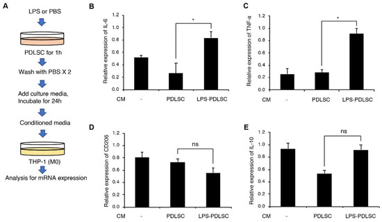 Effect of PDLSCs or LPS-preconditioned PDLSCs on the polarization of the macrophage cell line, THP-1. (A) Schematic diagram for the experimental process. M1 or M2 polarization of THP-1 cells by the conditioned media from PDLSCs or Lipopolysaccharide (LPS)-preconditioned PDLSCs. Relative mRNA expression of interleukin (IL)-6 (B), Tumor necrosis factor (TNF)-α (C), CD206 (D), and IL-10 (E) were analyzed by RT-qPCR. CM: the conditioned medium from PDLSC and LPS-PDLSC. Data are shown as the mean ± SD, n = 3, ns: not significant, * p < 0.05.
